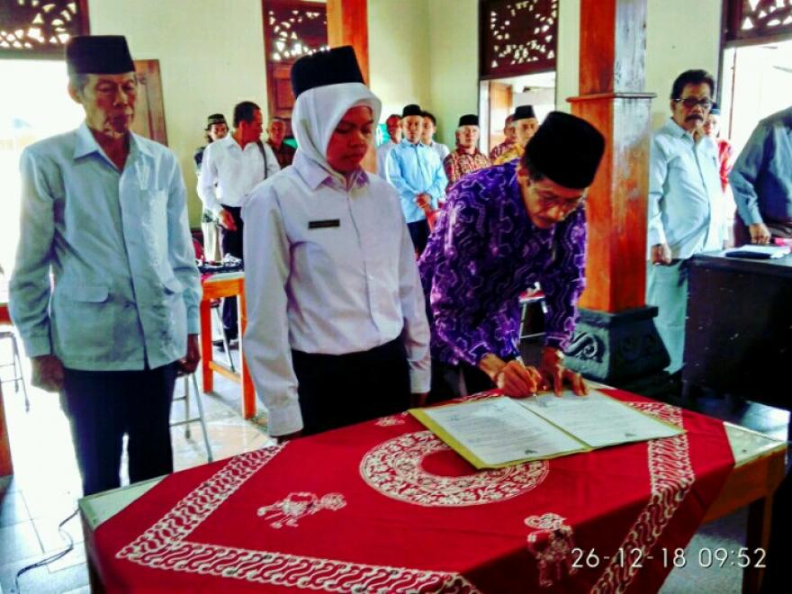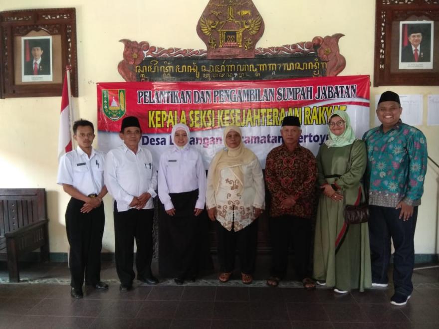 Pembacaan SK pelantikan dilakukan oleh Sekretaris Desa Bapak Ahmad Faozi Farkhan, S.Kom. Saksi pelantikan ialah Ketua BPD Bapak H. Sudarmadja dan Ketua LPMD Bapak H. Sudhief Hartasa, S.E. Sedangkan rokhaniawan ialah Bapak H. Muh Suhud.